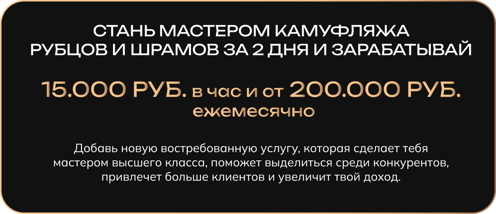 которые будут обращаться именно к тебе за помощью, потому что проблемы с рубцами и шрамами актуальны для многих людей, и спрос на качественный камуфляж постоянно растет, а специалистов ещё не так много